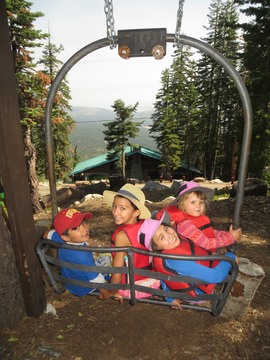 taking a rest on ski lift swing chair on the way to canoeing