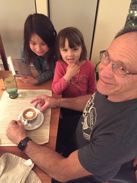 monkey face in old guy’s espresso - thank you for the many, many wonderful meals, Laura!