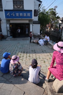 The vet hospital treats a dog with a uterine infection on the sidewalk