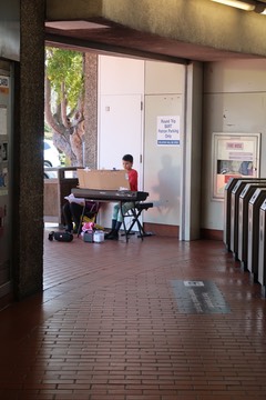 Then - serendipity. Sometimes, Terren and Koda have to practice music in crazy places: hanging out of the car, standing on as sidewalk, some random hotel piano, a church piano. On one of these days when we toted the euphonium to our favorite Japanese restaurant Kirala where we know we have a 20 minute wait for the first seating, Terren pulls out on a side street to practice. A few minutes later, the older man behind us in line asked Justin, “Is that your daughter? Is she busking?” Justin told him that she was just practicing.